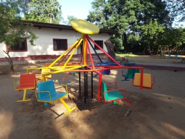 Für das Waisenhaus kam ein Karussel, eine Wippe, eine Schaukel und ein Turm zum Raufklettern und zum Runterrutschen.
